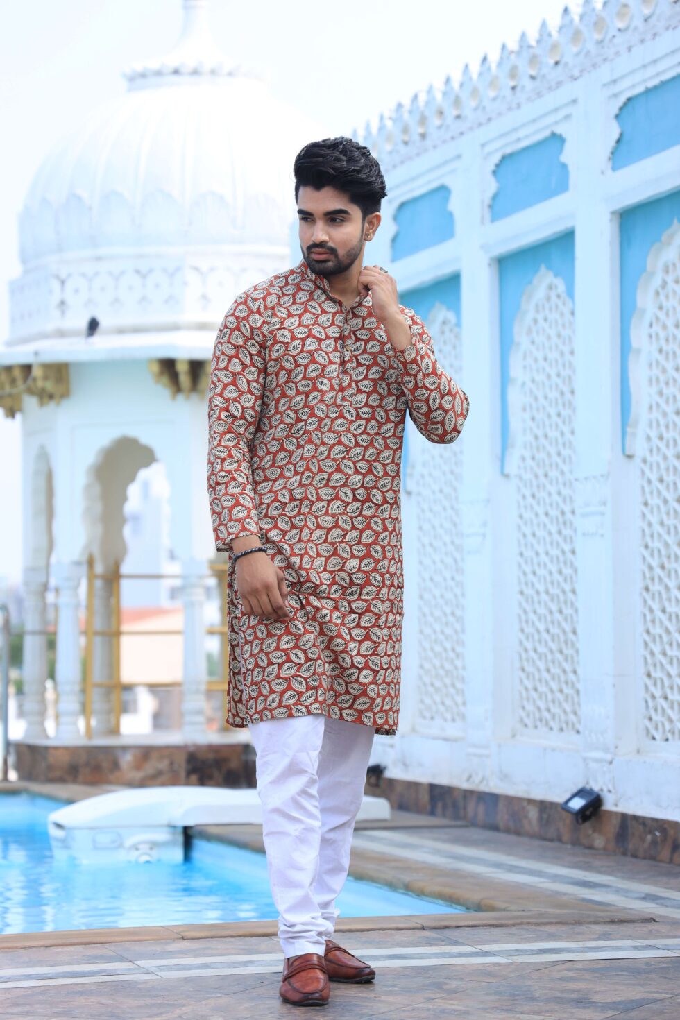 Upgrade your ethnic wardrobe with this men’s beige printed cotton kurta pyjama set. Made from premium-quality cotton, it offers a relaxed fit and all-day comfort while keeping your look refined and festive-ready.