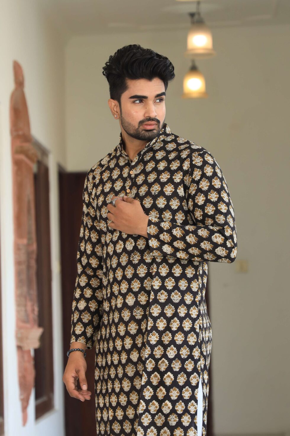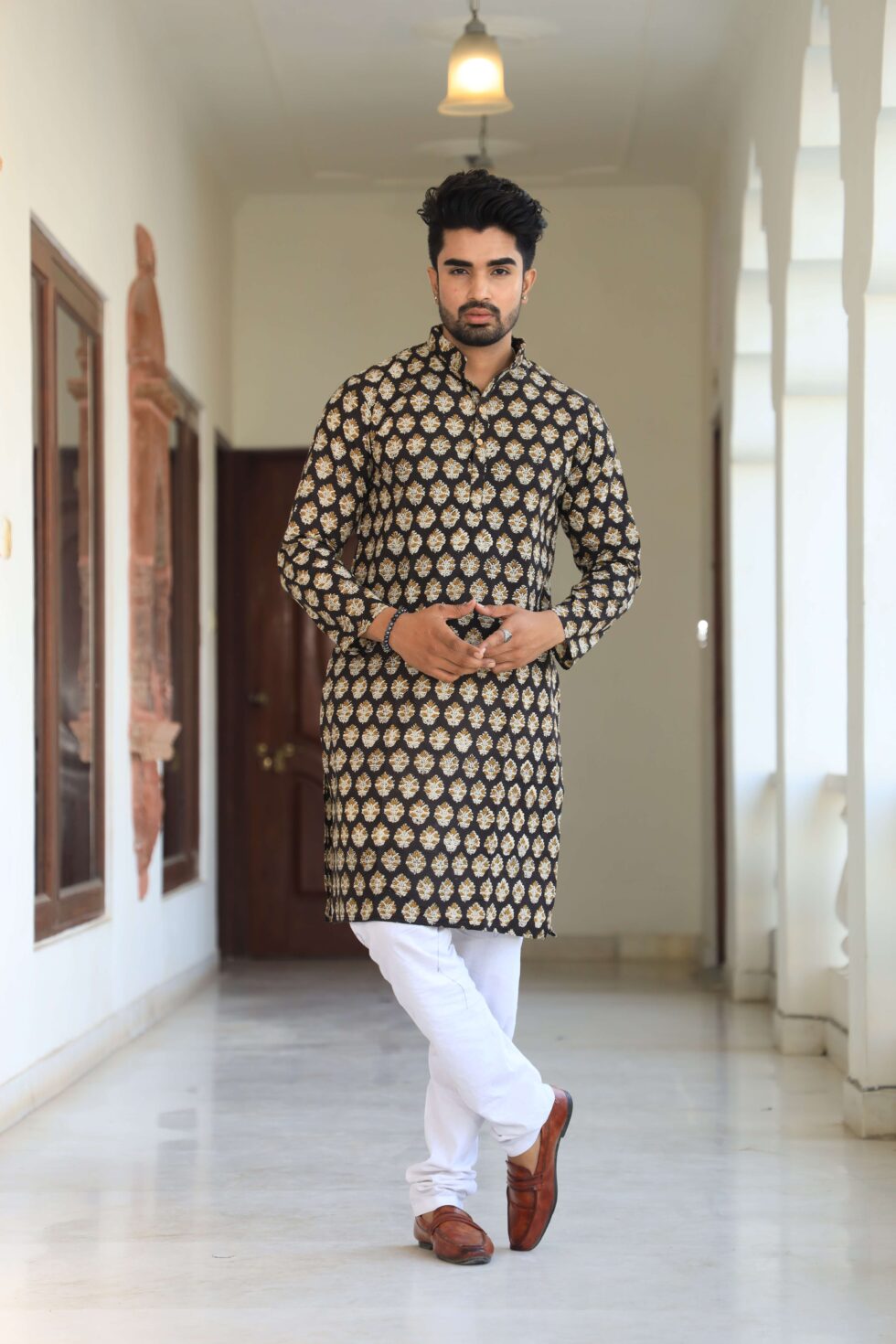 Upgrade your ethnic wardrobe with this men’s black printed cotton kurta pyjama set. Made from premium-quality cotton, it offers a relaxed fit and all-day comfort while keeping your look refined and festive-ready.